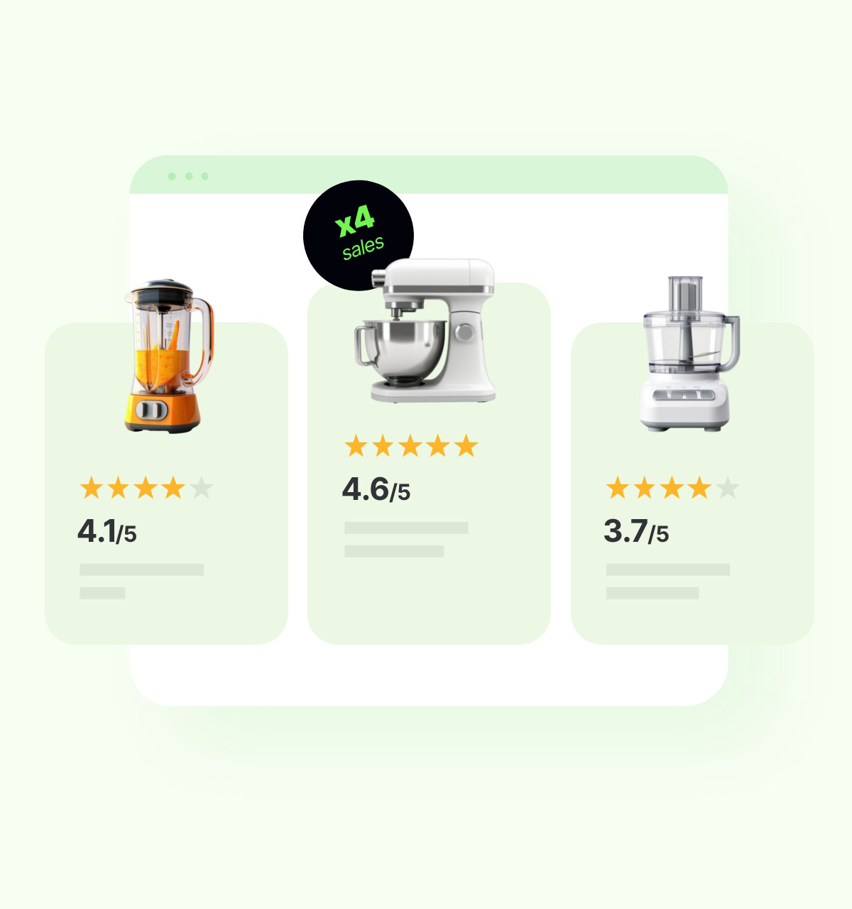 Wenn Sie die Kontrolle über Ihre Online Reputation übernehmen, werden Sie sehen, wie Ihre Markenbekanntheit wächst — und mit ihr auch Ihre Umsätze! Laut McKinsey & Company erzielen Produkte mit einer Bewertung von 4,5/5 oder mehr 4x mehr Umsatz!